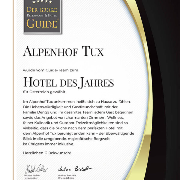 Erstmalig haben wir für 2021 die Auszeichnung von „Der Große Guide“ bekommen. Wir wurden vom Guide-Team zum „Hotel des Jahres“ für Österreich gewählt.