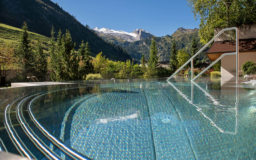 Der Panorama-Außen-Whirlpool wirkt entspannend und belebt zugleich. Die Aussicht auf die zahlreichen Dreitausender ist immer ein Erlebnis – egal ob beim letzten Sonnenstrahl im Sommer oder im glitzernden Winterweiß. Im Alpengarten verbindet sich Naturgenuss mit Erholung, und jeder Moment wird zum bewussten Durchatmen.