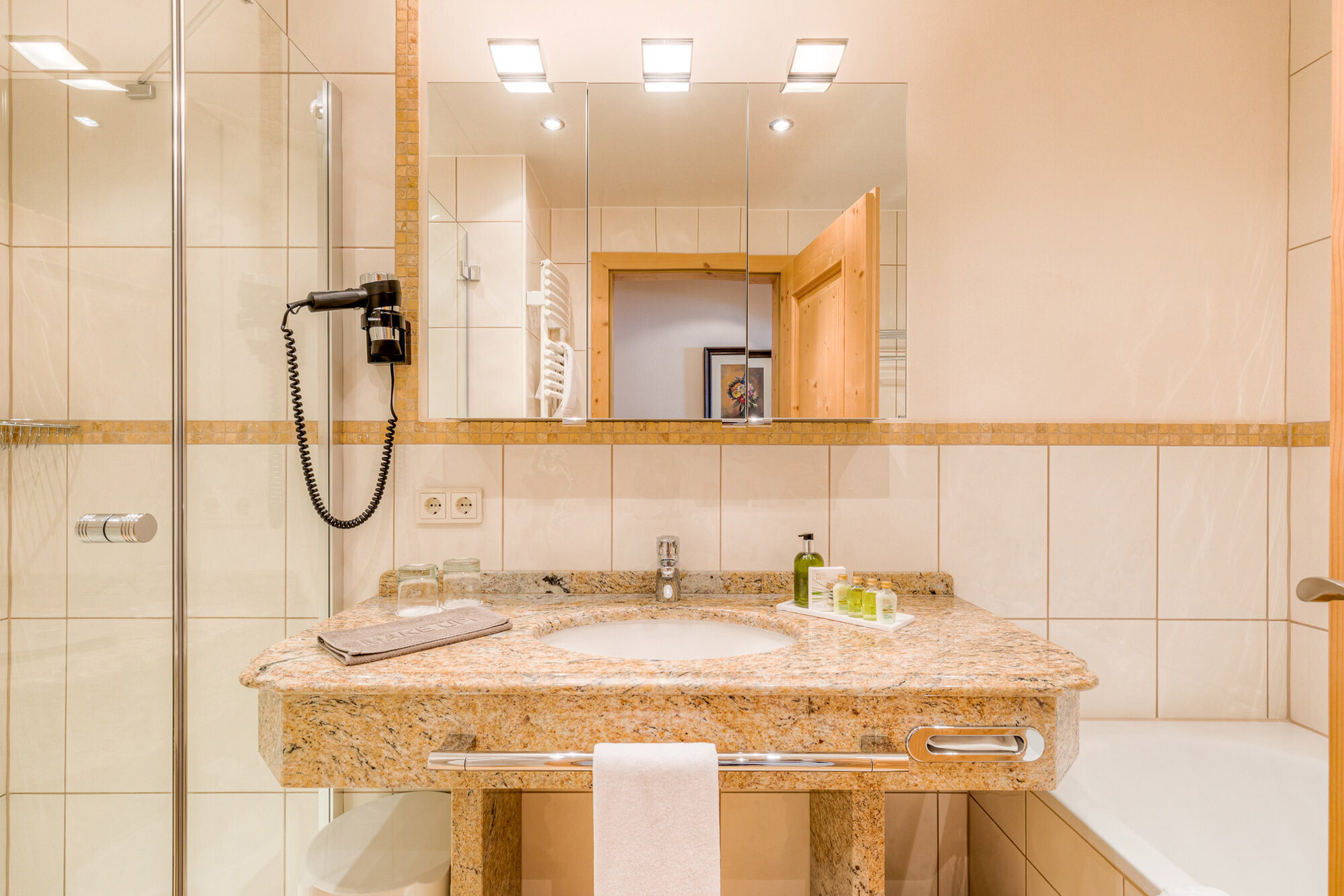 - Geräumiges Badezimmer mit Dusche und Badewanne – WC getrennt
